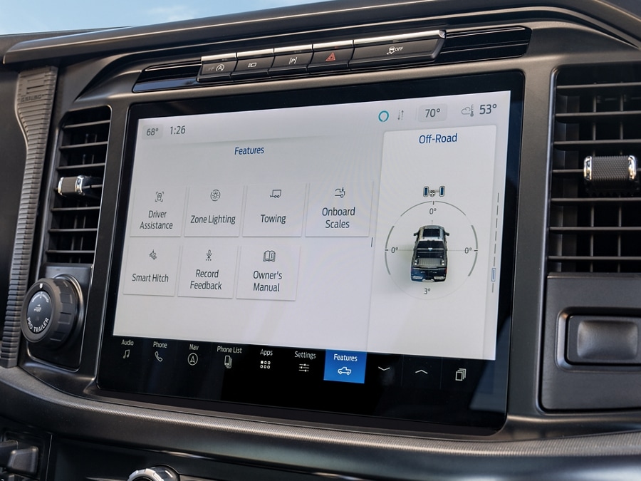 Smart towing technology helps make trailering and loading up simple. With the press of a button and assistance from the 12-inch display screen, integrated features can perform multiple tasks making hitching up, backing up and towing go smooth.